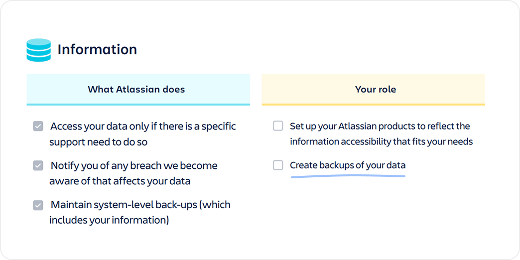 It’s not just our advice—it’s official Atlassian policy. In their Cloud Security Shared Responsibilities whitepaper, Atlassian defines the critical gap between their infrastructure and your responsibility.
